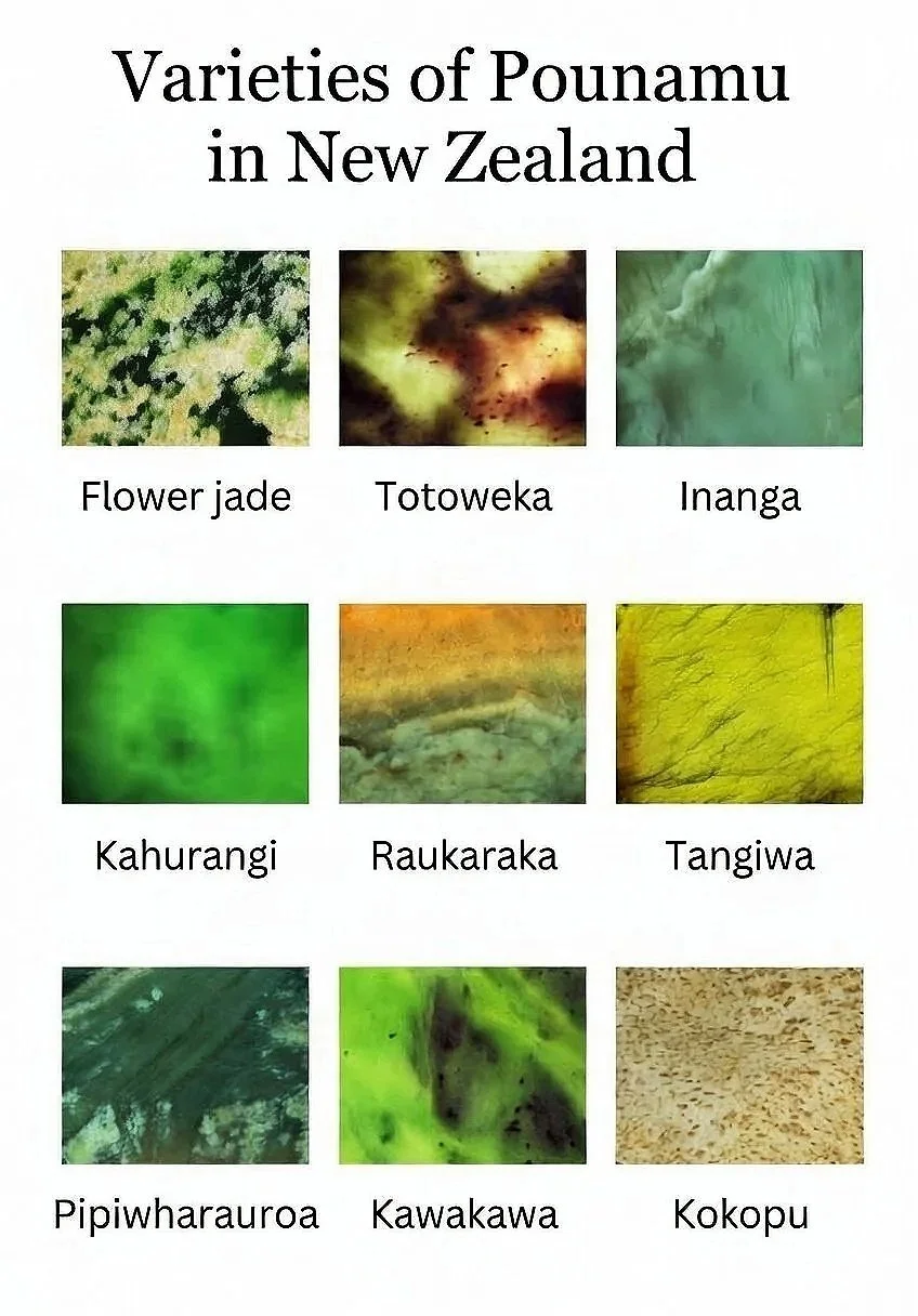 Pounamu is traditionally categorized into five main types, each with a distinctive spectrum of hues and characteristics:
